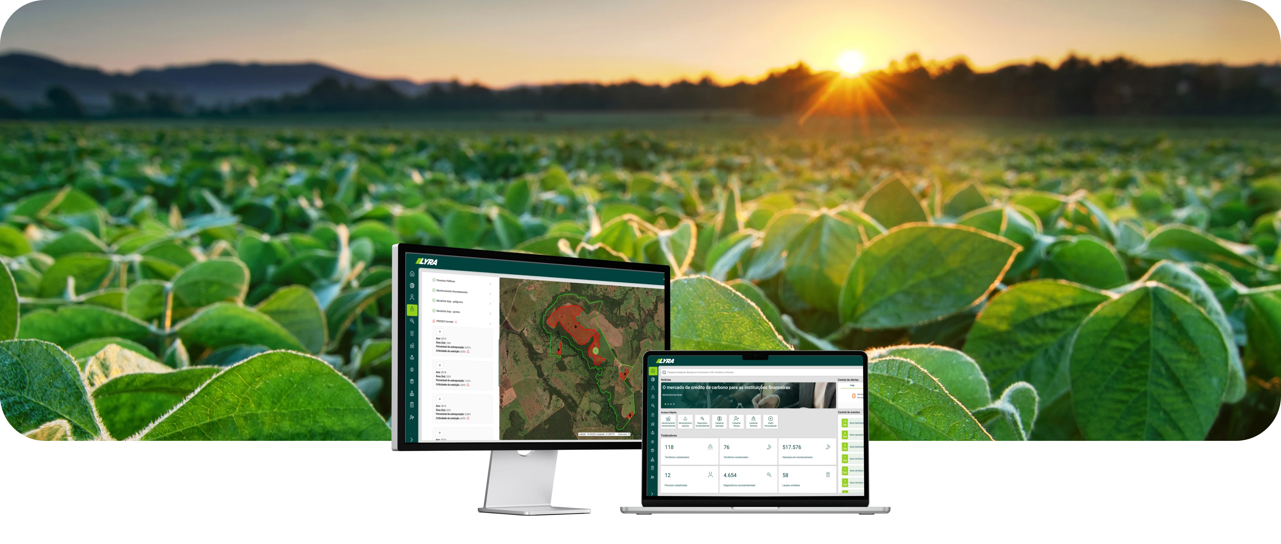 O LYRA é um sistema que, através de sensoriamento remoto e inteligência de dados, constrói a rastreabilidade da origem, realiza diagnóstico socioambientais de pessoas, empresas e territórios, monitoramento agroclimático e inteligência territorial. Ele se baseia nas camadas públicas e privadas de risco socioambiental e agrícolas, agregando valor e mitigando riscos reputacionais e das negociações.